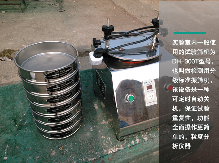實驗室內一般使用的試驗篩機為DH-300T型號,也叫做檢測用分級標準振篩機,該設備是一種可定時自動關機,保證試驗重復性,功能全面操作更簡單的,粒度分析儀器。可將一種顆粒料同時精密分出2~8個粒子段。可用于漿液料的細度及雜物含量分析,噪音小,重量輕;平臺操作,無須固定。調節(jié)振動快,可調節(jié)振幅。